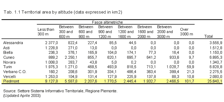 Piemonte is largely a mountain region (high, medium and low). The name itself indicates its location near the mountains. The table below illustrates the altitude levels within the region. 34% of the territory is above 600 m from the sea level. It boasts a small number of over 3.000 m peaks. The mountains are mostly Alps and located in the western and northern parts of the region. At south, the Appennine divides with Liguria.