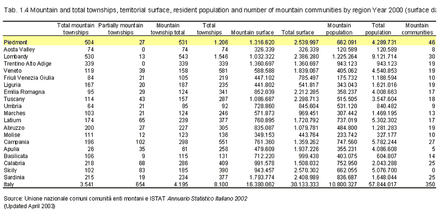 The overall mountain territory covers 1.3 ml sqm (around 52% of the total area), accounts for a population of over 660.000 inhabitants (around 15%) and includes 531 Communes (44%) and 48 Mountain Communities (13% in Italy).